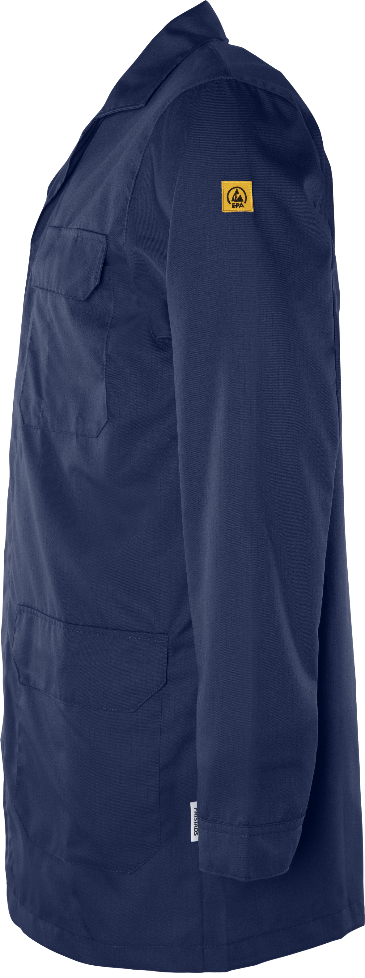 Verdeckte Druckknopfleiste / Brusttasche mit Stifttasche, Patte mit Druckknopf / 2 Vordertaschen mit Patten und Druckknöpfen / Rückseitiger Bewegungsschlitz / Ärmel mit Druckknopf verstellbar / Geprüft und zugelassen gemäß IEC 61340 / OEKO-TEX® zertifiziert.