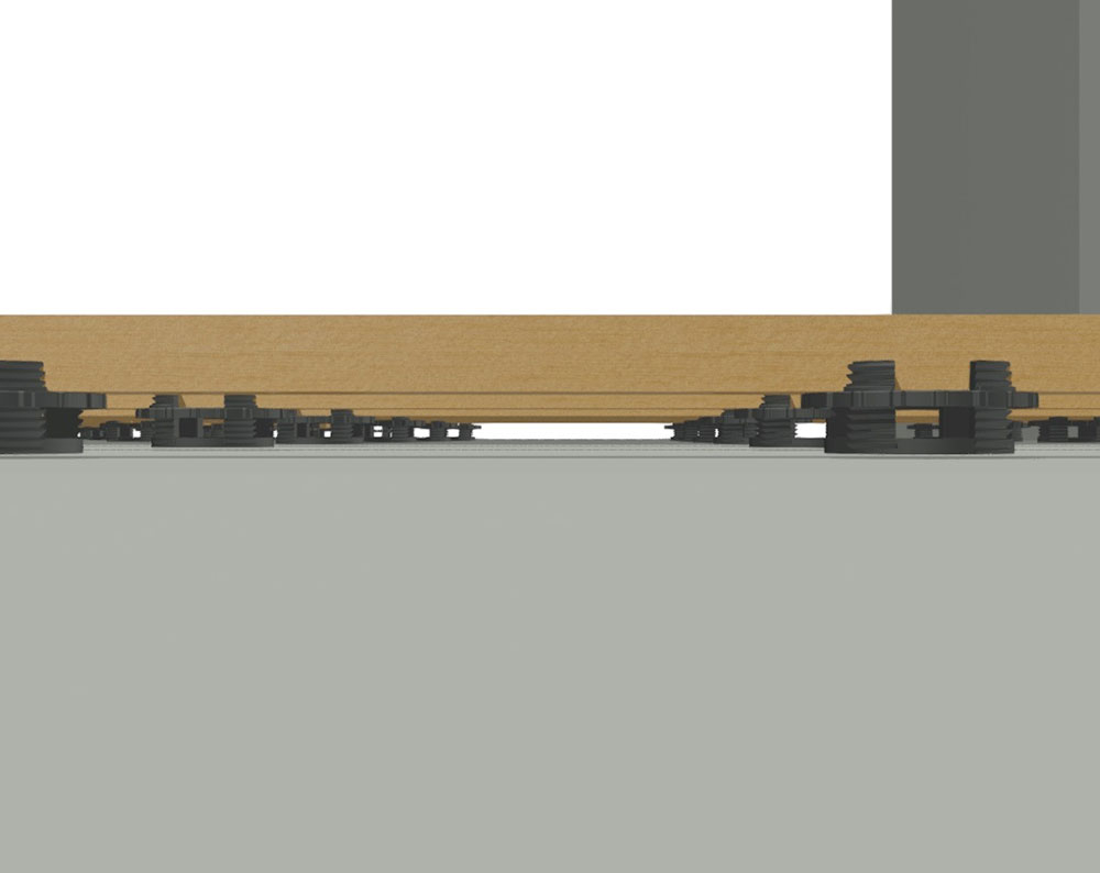 Das Cradle-System ist ein einfaches Auflagesystem für die Unterkonstruktion von Holzböden im Innenausbau. Durch den Gewindering lässt sich die Höhe des Cradles stufenlos zwischen 10 und 45 mm anpassen, sodass Gefälle ausgeglichen werden können. Es ist sowohl für 40 mm als auch für 60 mm Traghölzer geeignet. Diese werden mithilfe des Cradles schwimmend, ohne Verschraubung verlegt.