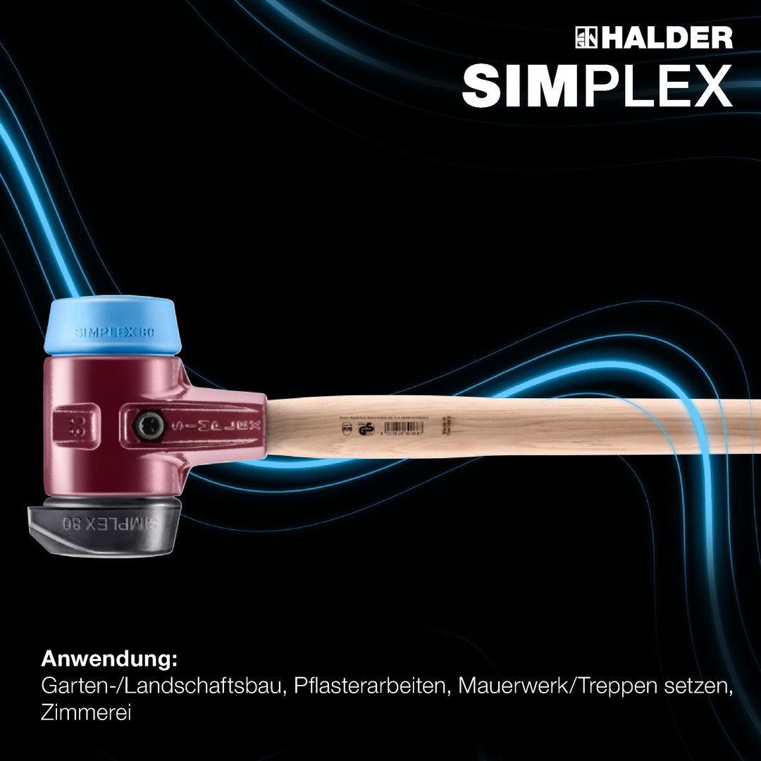 - SIMPLEX–Vorschlaghammer in der Einsatzkombination TPE-soft (blau, weich, abriebfrei) / Gummi-Einsatz mit Standfuß für rückenschonendes Arbeiten und weniger bücken.