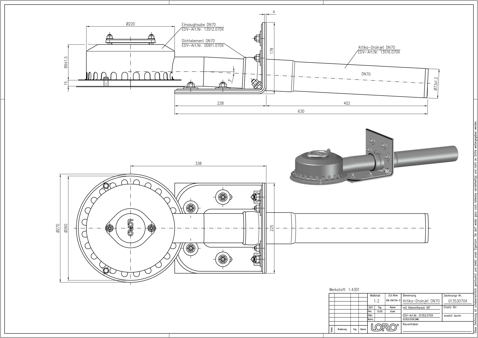 LORO-X DRAINJET Attika-Schnellablauf, Serie 62 ohne Eingriff ins Dach, für Hauptentwässerung mit Druckströmung, Abflussleistung 16,0 l/s bei 55 mm Wasserhöhe auf dem Dach, mit Klemmflansch, als Los- und Festflanschkonstruktion, 90 Grad Aufkantung für Kunststoff-Abdichtungsbahnen, Eingrifftiefe 0 mm, nach DIN EN 1253, Leistungsnachweis mit normgerechtem Prüfsystem mit 4,2m nicht belüfteter Fallleitung gemäß Systemdatenblatt LX636, aus Edelstahl, DN 70