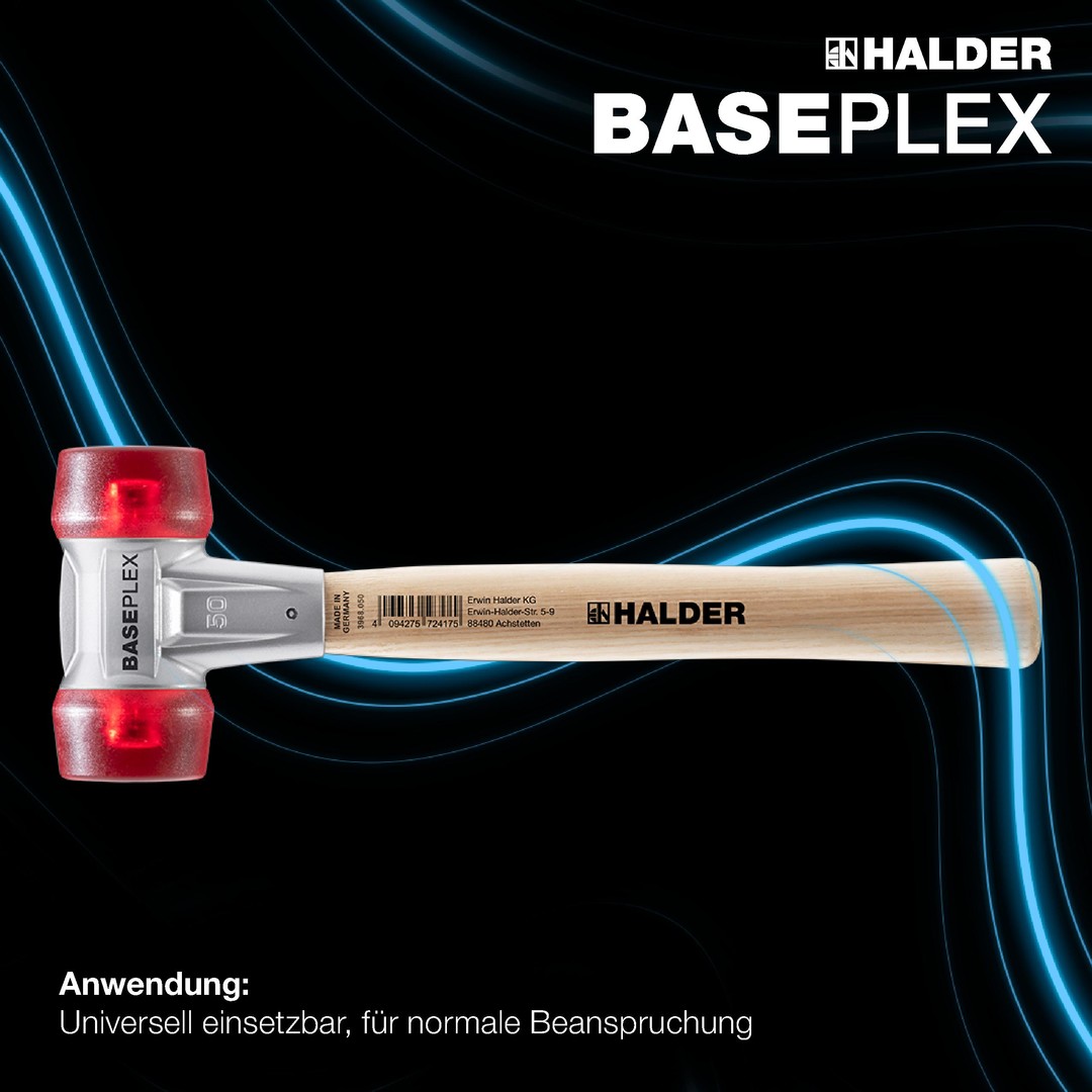 - BASEPLEX-Schonhammer mit beidseitig Celluloseacetat-Einsätzen (rot, hart, öl- und fettbeständig).