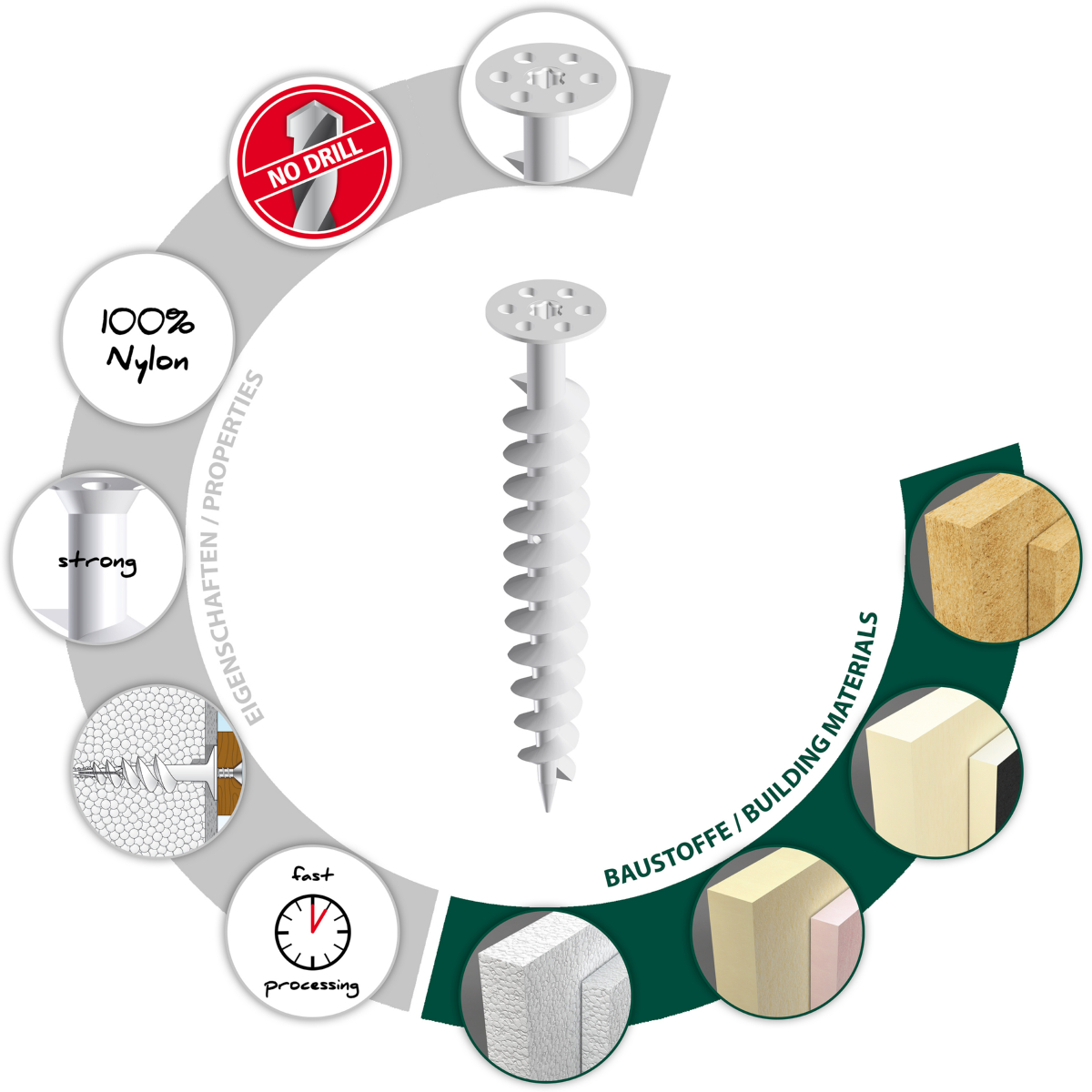 - Dämmstoffdübel ohne Vorbohren direkt in den Untergrund einschrauben