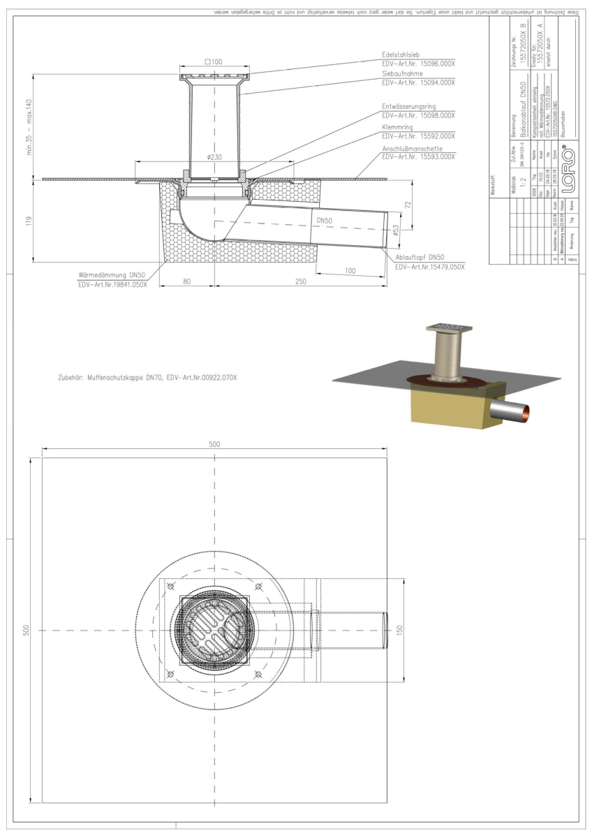 LORO-X Balkonablauf, Serie F, einteilig mit Wärmedämmung, Auslauf seitlich 3 Grad, mit vormontierter Anschlussmanschette aus Bitumen EPDM Verbund, nach DIN EN 1253 mit erhöhtem Qualitätsstandard gemäß RAL-Gütezeichen GZ-694, aus Stahl feuerverzinkt, mit langlebiger Beschichtung gemäß DIN EN ISO 2178 auf Basis einer 2K-Epoxid-Kombination, Farbton: Rotbraun, bestehend aus Ablauftopf, Anschlussmanschette, Klemmring, Entwässerungsring, Siebaufnahme 100 x 100 mm (für Aufbauhöhe 35 - 140 mm), Edelstahlsieb DN 50