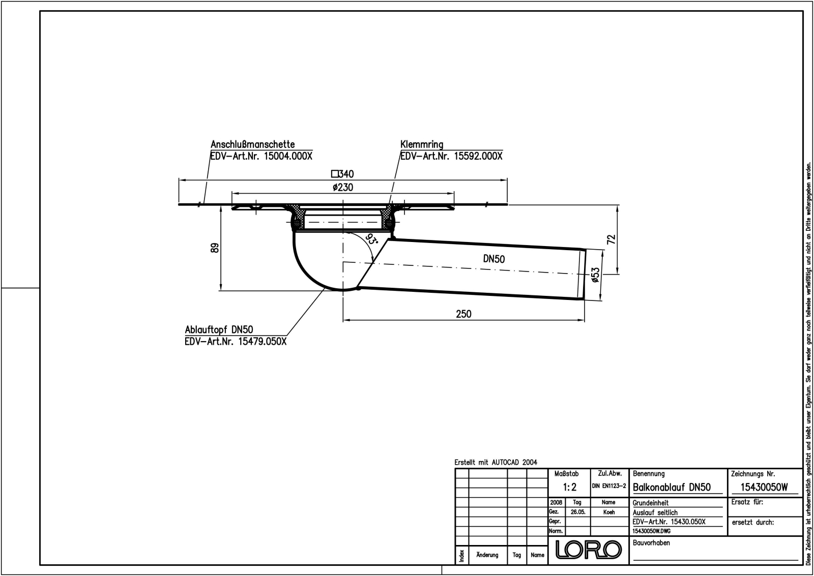 LORO-Balkonablauf-Grundeinheit, mit VS-Anschlussmanschette aus Mehrlagen-Verbundwerkstoff, Serie FF, aus Stahl, feuerverzinkt , langlebige Innenbeschichtung gemäß DIN EN ISO 2178 auf Basis einer 2K-Epoxid-Kombination, Farbton: Rotbraun, Auslauf seitlich, ohne Wärmedämmung, einteilig, bestehend aus Ablauftopf, VS-Anschussmanschette, Klemmring, DN 50