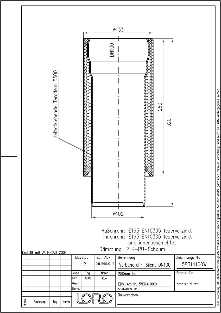LORO-X Verbundrohr, Ausführung SILENT, für erhöhte Schalldämmung, bestehend aus: Innenrohr (LORO-X Rohr, aus Stahl, feuerverzinkt, nach DIN EN 1123, mit erhöhtem Qualitätsstandard gemäß RAL-Gütezeichen GZ-694, mit 2-Kammern-Steckmuffenverbindung, Baustoffklasse A1, formstabil, bruchfest, rückstausicher, langlebige Innenbeschichtung gemäß DIN EN ISO 2178 auf Basis einer 2K-Epoxid-Kombination, Farbton: Rotbraun), Schallschutzmatte (am Innenrohr angebracht), Dämmschicht (PU-Hartschaum B2, FCKW-frei) und Außenrohr (LORO-X Rohr, feuerverzinkt) 250 mm lang, DN 100