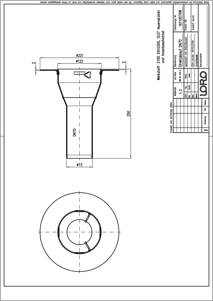 LORO-X Balkondirektablauf, Serie GF mit Stützrand, Auslauf senkrecht, für Abdichtung mit Flüssigkunststoffen/Verbundabdichtungen, für Belag von 2 - 3 mm, nach DIN EN 1253 mit erhöhtem Qualitätsstandard gemäß RAL-Gütezeichen GZ-694, aus Stahl feuerverzinkt, mit langlebiger Beschichtung gemäß DIN EN ISO 2178 auf Basis einer 2K-Epoxid-Kombination, Farbton: Rotbraun, ohne Sieb, DN 70