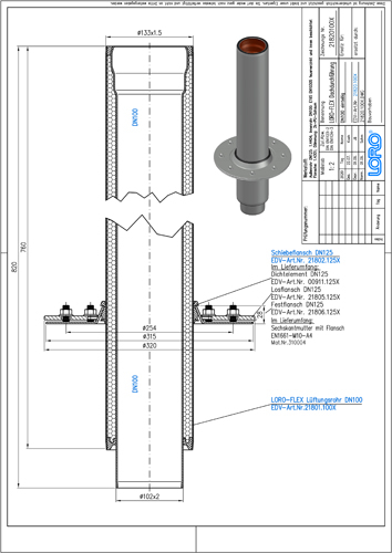 LOROFLEX Flachdachdurchführung einteilig, bestehend aus: Durchführungsrohr wärmegedämmt (Innenrohr aus Stahl, feuerverzinkt , langlebige Innenbeschichtung gemäß DIN EN ISO 2178 auf Basis einer 2K-Epoxid-Kombination, Farbton: Rotbraun Außenrohr aus Edelstahl, Baustoffklasse A1, Wärmedämmung aus PU-Hartschaum ist selbstverlöschend nach ASTM 1692-74T) und ein Schiebeflansch mit Dichtelement, DN 100