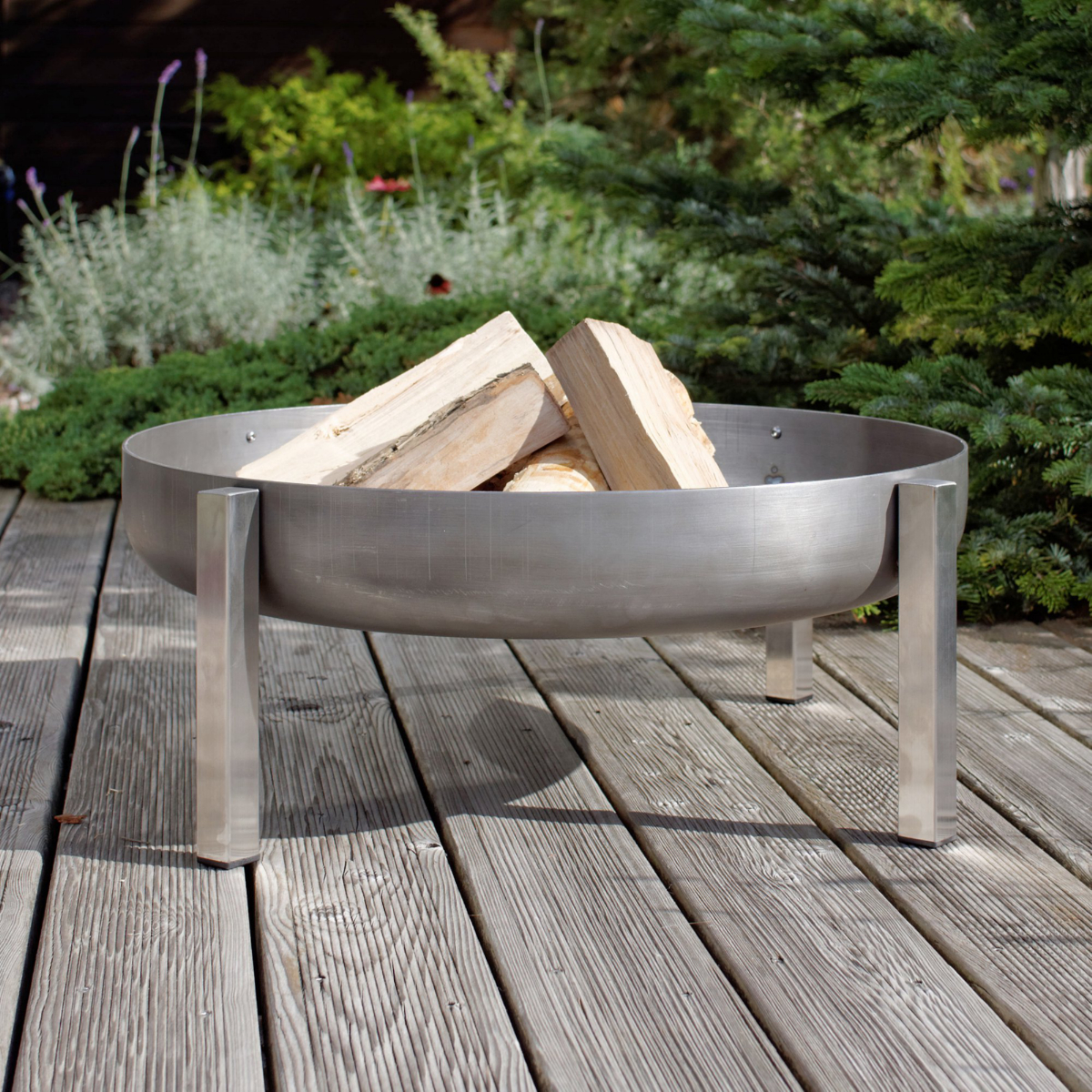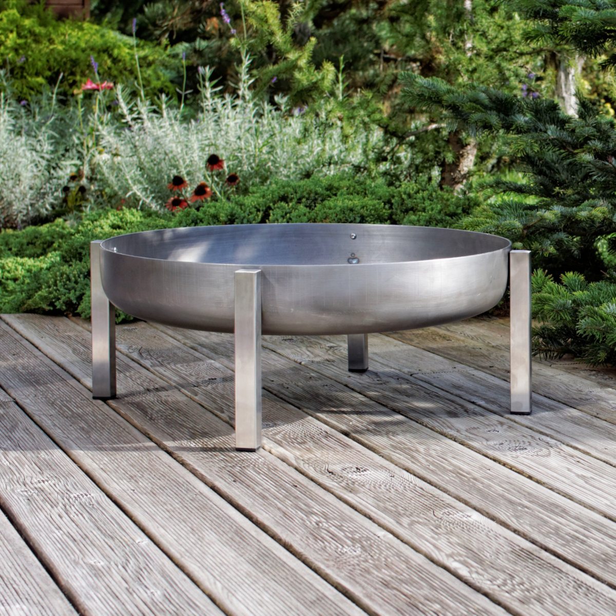 Schwere robuste Feuerschale FIRE XXL aus massivem Rohstahl (rostend, Materialstärke 3,2 mm ) - Füße Edelstahl gebürstet. Die Lieferung erfolgt demoniert: Beine werden einfach gesteckt und verschraubt. Diese solide Feuerschale wird in einer europäischen Designer-Werkstatt weitgehend in Handarbeit hergestellt und entspricht höchsten Qualitätsansprüchen. Schrauben sind im Lieferumfang enthalten.