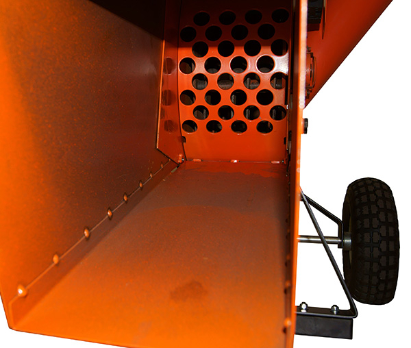 - Über den großen Einfülltrichter werden Sträucher, Blätter und dünne Äste bis 10 mm Durchmesser den pendeld aufgehangenen Schlaghämmern zugeführt.