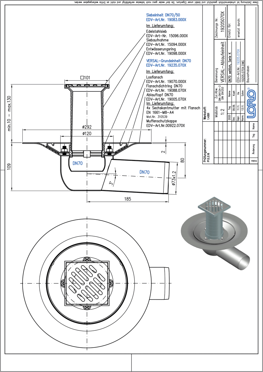 LORO-X VERSAL Balkonablauf, Serie K, einteilig ohne Wärmedämmung, Auslauf seitlich 3 Grad, mit Klemmflansch, nach DIN EN 1253 mit erhöhtem Qualitätsstandard gemäß RAL-Gütezeichen GZ-694, aus Edelstahl, bestehend aus Ablauftopf, Flanschdichtring, Losflansch, Entwässerungsring, Siebaufnahme 100 x 100 mm (für Aufbauhöhe 10 - 130 mm), Edelstahlsieb, DN 70