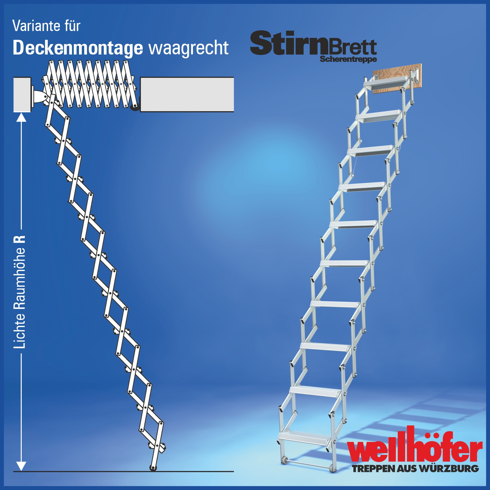 Platzsparende Aluminium-Scherentreppe für den nachträglichen Einbau – wahlweise zur waagrechten Deckenmontage oder senkrechten Wandmontage.