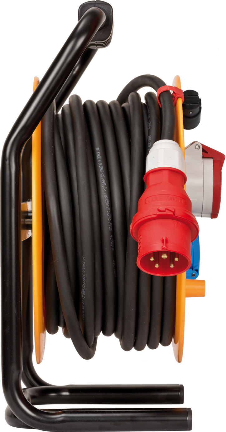 - Kabeltrommel mit 30m RN-Kabel (H07RN-F 5G2,5) eignet sich ideal für den ständigen Einsatz im Außenbereich - zugelassen für erschwerte Baubedingungen nach VDE 0100 Teil 704