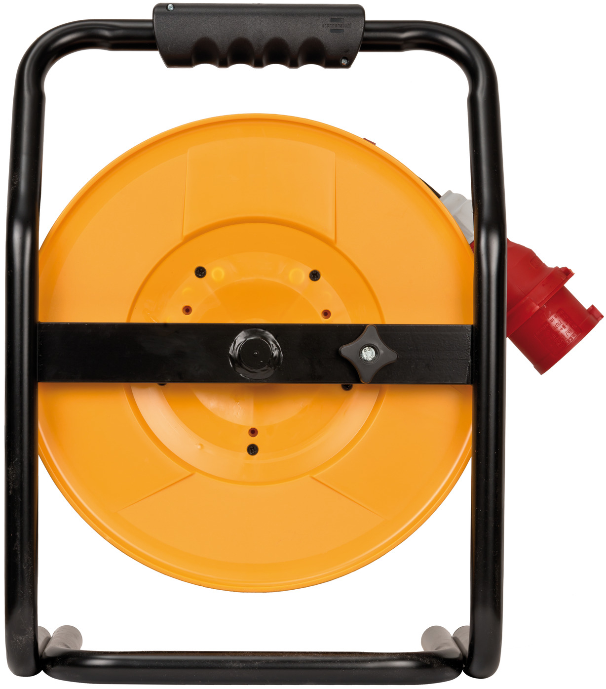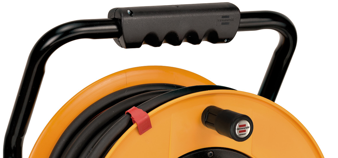 - CEE Kabeltrommel mit stabilem Klapp-Drehgriff für ein komfortables Aufrollen