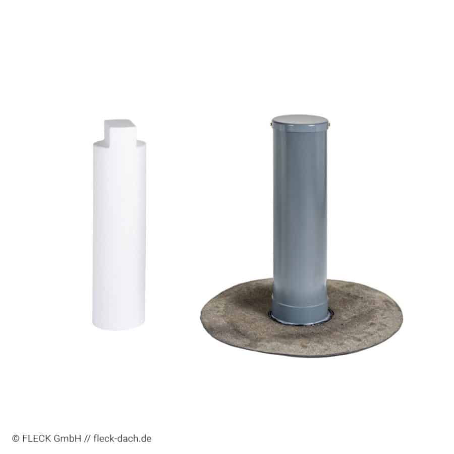- Flansch-Manschette aus Bitumen-Schweißbahn (PYE PV 200 S4 besandet) oder Hart-PVC lieferbar