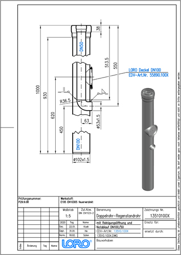LORO-X Haupt-Not-Kombi Regenstandrohr Rohr-in-Rohr mit 2-Kammern-Steckmuffenverbindung und Ausfuhr des innenliegenden Rohres unterhalb der Reinigungsöffnung, aus Stahl, feuerverzinkt, DN 100/50