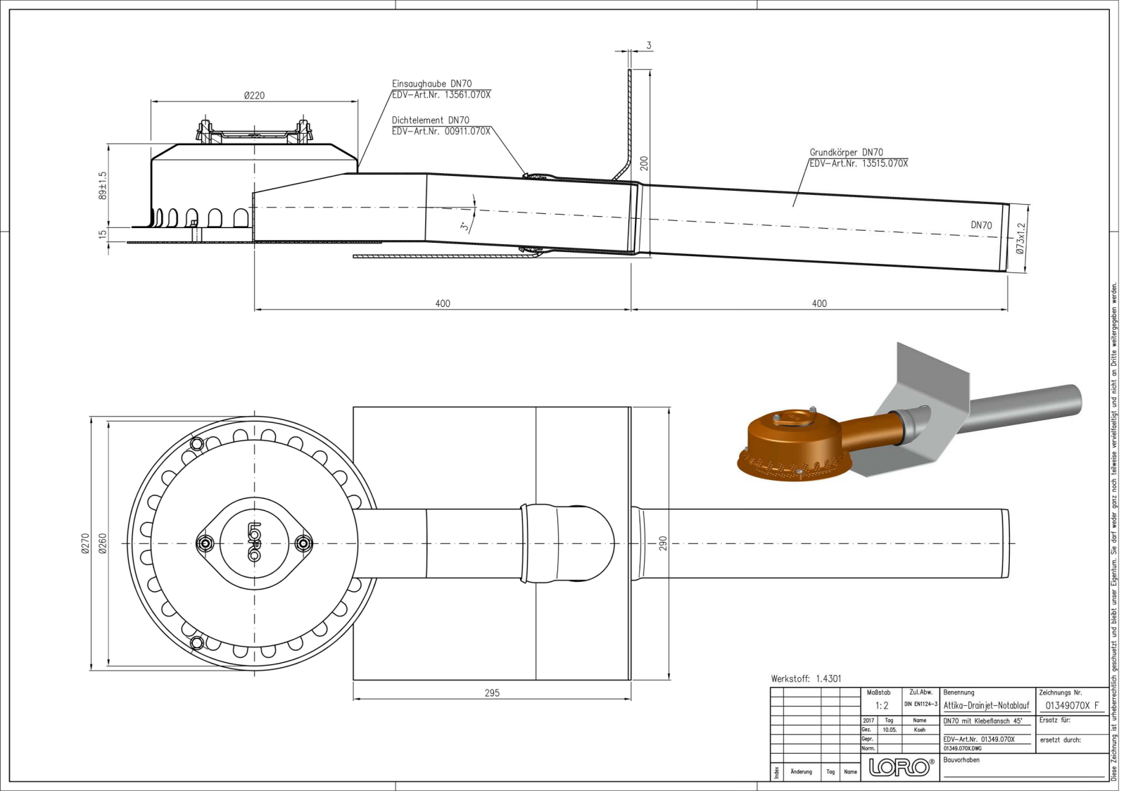 LORO-X DRAINJET Attika-Schnellablauf, Serie 62 ohne Eingriff ins Dach, für Notentwässerung mit Druckströmung, Abflussleistung 14,5 l/s bei 75 mm Wasserhöhe auf dem Dach und 50 mm Wehrhöhe, mit Klebeflansch, 45 Grad Aufkantung für Bitumen-Abdichtungsbahnen, Eingrifftiefe 0 mm, nach DIN EN 1253, Leistungsnachweis mit normgerechtem Prüfsystem mit 4,2m nicht belüfteter Fallleitung gemäß Systemdatenblatt LX637, aus Edelstahl, DN 70
