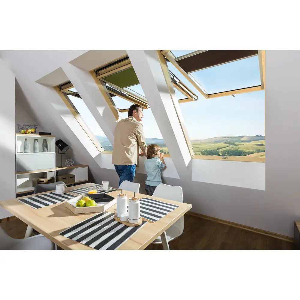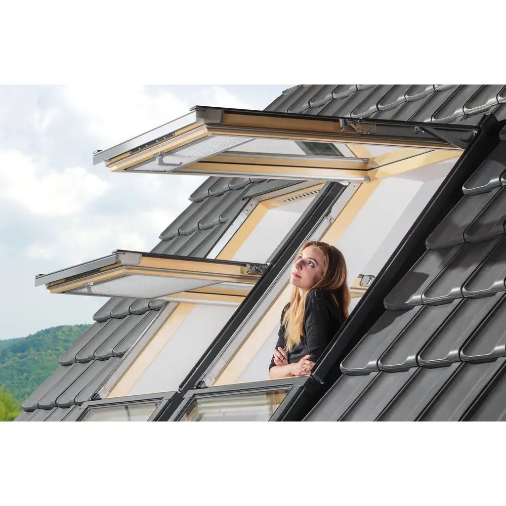 Klapp-Schwing-Fenster überzeugen durch ihre moderne, funktionelle Konstruktion und einfache Bedienung. Sie verfügen über zwei getrennte (voneinander unabhängige) Flügelöffnungsfunktionen: die Schwing- und die Klappfunktion. Durch die Klappfunktion lässt sich der Flügel in einem Öffnungswinkel zwischen 0°–45° Grad beliebig arretieren. Mit der  Schwingfunktion kann der Flügel um bis zu 180 ° Grad geschwenkt werden. Neuartige Beschläge garantieren die volle Stabilität des Flügels sowohl in der Schwing- als auch in der Klappfunktion. Die Umstellung von der Schwing- auf die Klappfunktion (und umgekehrt) erfolgt bequem mit dem am Blendrahmen befindlichen, nach dem Öffnen des Fensters sichtbaren, preSelect-Schalter. Die Klapp-Schwing-Fenster sind mit der automatischen Dauerlüftung V40P ausgestattet, die für einen effektiven Zustrom von frischer Luft sorgt. Die Dauerlüftung V40P sichert ein gesundes Mikroklima im Dachgeschoss.