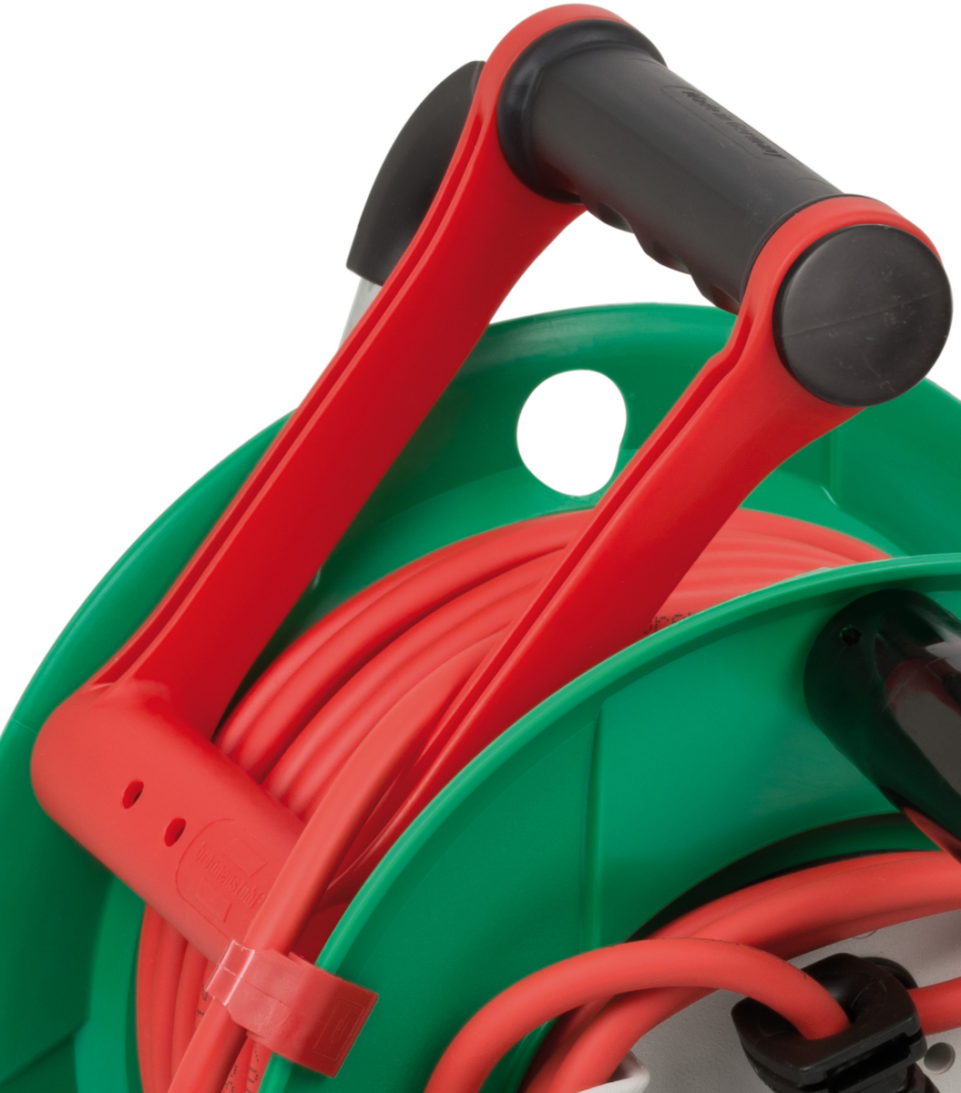 • Kabeltrommel mit stabilem Klapp-Drehgriff für ein komfortables Aufrollen und einer praktischen Steckergarage zum schnellen Verstauen des Kabels