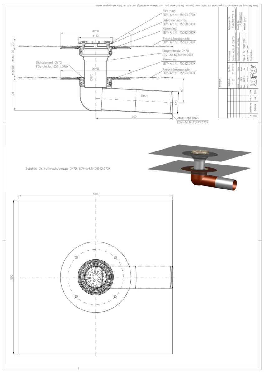 LORO-X Balkonablauf, Serie E, zweiteilig ohne Wärmedämmung, Auslauf seitlich 3 Grad, mit vormontierter Anschlussmanschette aus Bitumen EPDM Verbund, nach DIN EN 1253 mit erhöhtem Qualitätsstandard gemäß RAL-Gütezeichen GZ-694, aus Stahl feuerverzinkt, mit langlebiger Beschichtung gemäß DIN EN ISO 2178 auf Basis einer 2K-Epoxid-Kombination, Farbton: Rotbraun, bestehend aus Ablauftopf, Anschlussmanschette, Klemmring, Dichtelement, Etageneinsatz (für Aufbauhöhe 40 - 120 mm), Anschlussmanschette, Klemmring, Entwässerungsring, Sieb rund, DN 70