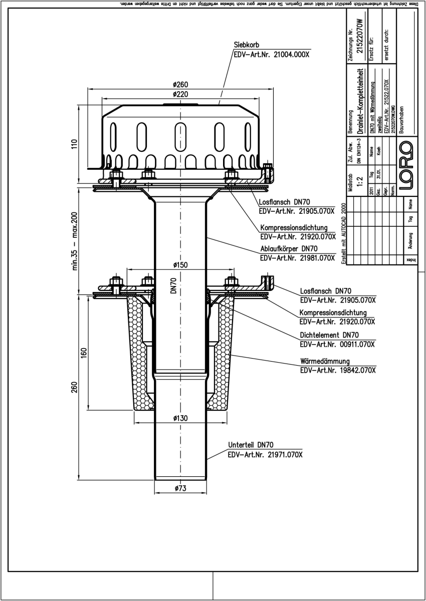 LORO-X DRAINLET Flachdachablauf, Serie 84(DL) zweiteilig mit Wärmedämmung, Auslauf senkrecht, für Hauptentwässerung mit Freispiegelströmung, Abflussleistung 6,3 l/s bei 35 mm Wasserhöhe auf dem Dach, mit Klemmflansch als Los- und Festflanschkonstruktion inklusive Kompressionsdichtungen, für Bitumen- und Kunststoff- Abdichtungsbahnen, DRAINLET-Haube aus Edelstahl, nach DIN EN 1253 mit erhöhtem Qualitätsstandard gemäß RAL-Gütezeichen GZ-694, Leistungsnachweis mit normgerechtem Prüfsystem mit 4,2m nicht belüfteter Fallleitung gemäß LX-Datenblatt LX846, aus Edelstahl, DN 70