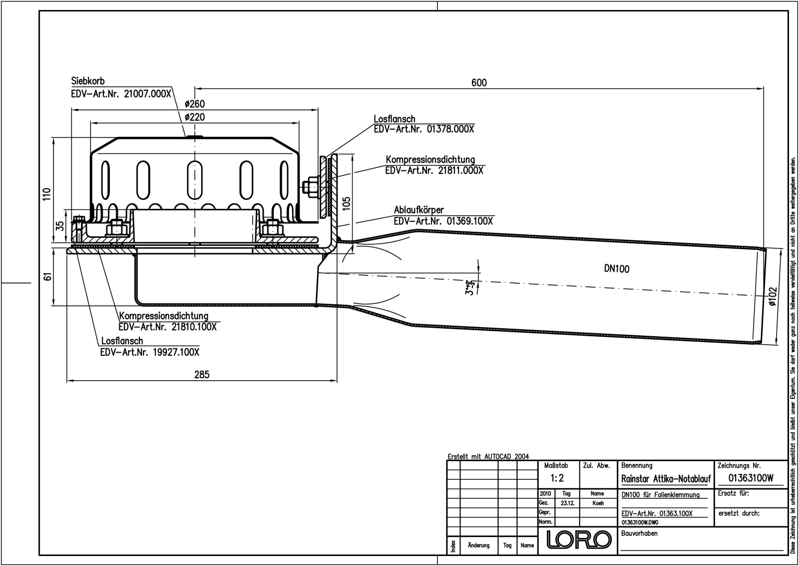LORO-X RAINSTAR Attikaablauf, Serie 89 mit geringer Einbautiefe für Notentwässerung mit Freispiegelströmung, aus Edelstahl, DN 100, mit Klemmflansch, als Los- und Festflanschkonstruktion, 90 Grad Aufkantung für Kunststoff-Abdichtungsbahnen, Eingrifftiefe 55 mm, mit DRAINLET-Haube aus Edelstahl, nach DIN EN 1253, Abflussleistung 8,0 l/s bei 75 mm Wasserhöhe auf dem Dach gemäß Systemdatenblatt LX668 mit 4,2m nicht belüfteter Fallleitung, Abflussleistung 4,6 l/s bei 75 mm Wasserhöhe auf dem Dach gemäß Systemdatenblatt LX667 als Speier.