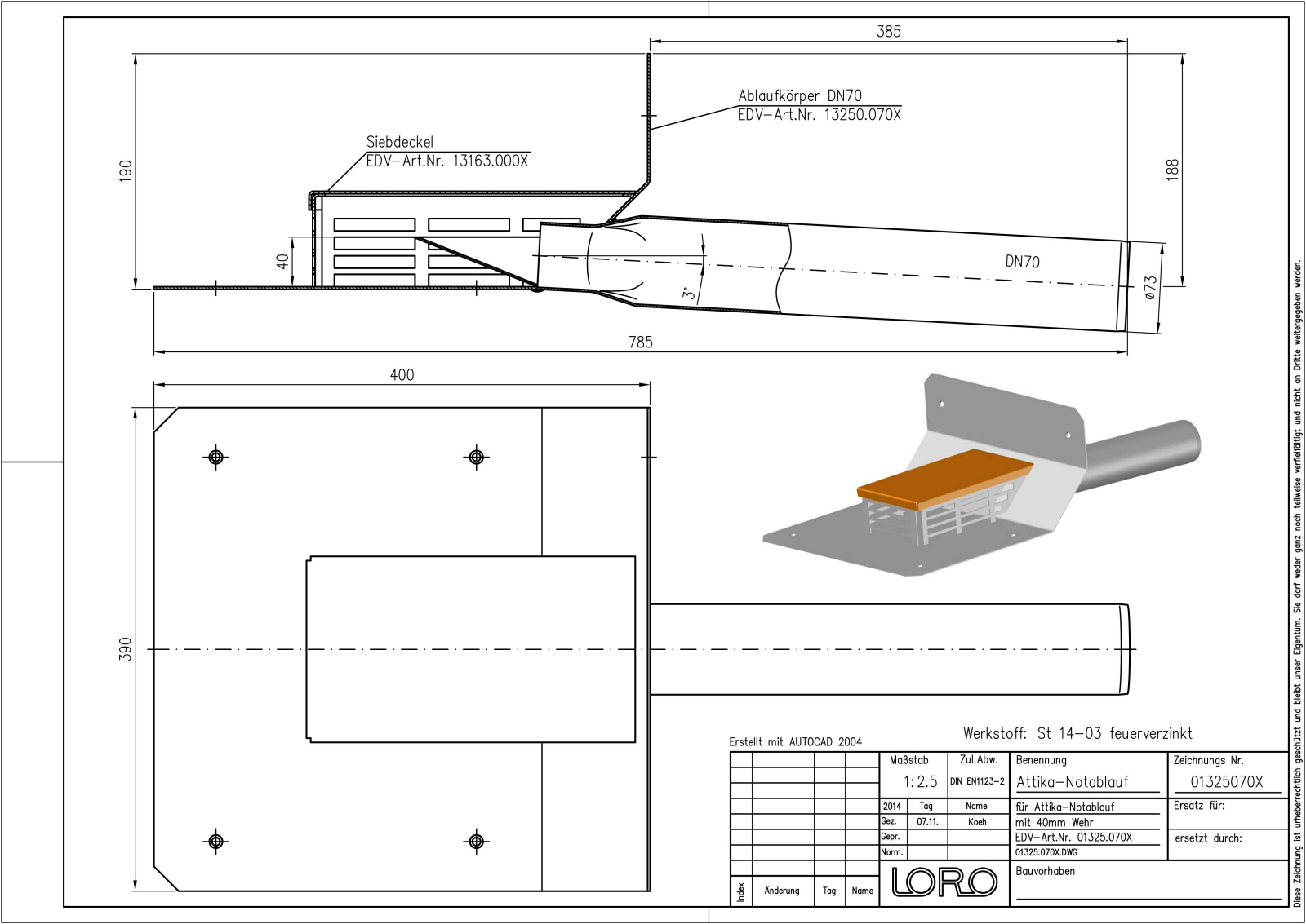 LORO-X Attikadirektablauf, Serie 43 ohne Eingriff ins Dach, für kleinere Dachflächen, für Notentwässerung mit Freispiegelströmung, Abflussleistung 1,7 l/s bei 75 mm Wasserhöhe auf dem Dach und 40 mm Wehrhöhe, mit Klebeflansch, für Bitumen-Abdichtungsbahnen, Eingrifftiefe 0 mm, nach DIN EN 1253, Leistungsnachweis als Speier ohne Fallleitung gemäß Systemdatenblatt LX1573, aus Stahl, feuerverzinkt, DN 70