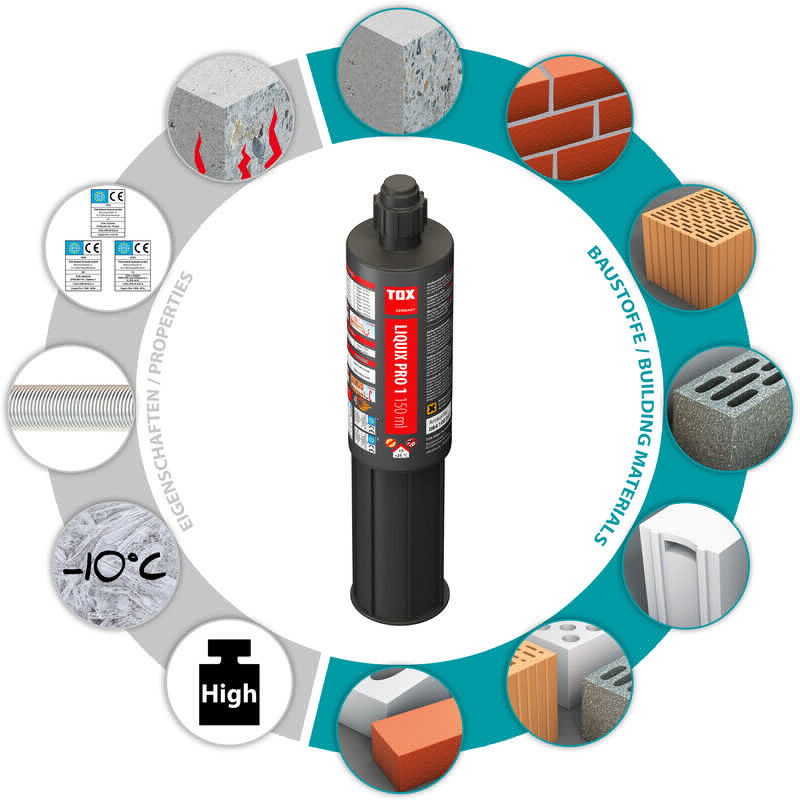 - Liquix Pro 1 ist ein styrolfreier Vinylester Verbundmörtel erhältlich in verschiedenen Kartuschentypen und Kartuschengrößen mit Statikmischer Liquix Mix