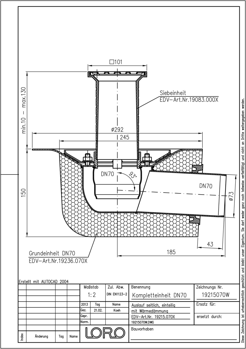 LORO-X VERSAL Balkonablauf, Serie K, einteilig mit Wärmedämmung, Auslauf seitlich 3 Grad, mit Klemmflansch, nach DIN EN 1253 mit erhöhtem Qualitätsstandard gemäß RAL-Gütezeichen GZ-694, aus Edelstahl, bestehend aus Ablauftopf, Flanschdichtring, Losflansch, Entwässerungsring, Siebaufnahme 100 x 100 mm (für Aufbauhöhe 10 - 130 mm), Edelstahlsieb, DN 70