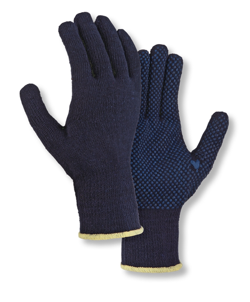 Baumwolle/Polyester-Strickgewebe, mit einseitig aufgebrachten blauen PVC-Noppen auf den Handinnenflächen, Strickbund, ca. 10 Gauge (= 2,588 mm)