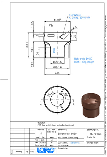 LORO-X Balkondirektablauf, Serie I mit Glocke, Auslauf senkrecht, nach DIN EN 1253 mit erhöhtem Qualitätsstandard gemäß RAL-Gütezeichen GZ-694, aus Stahl feuerverzinkt, mit langlebiger Beschichtung gemäß DIN EN ISO 2178 auf Basis einer 2K-Epoxid-Kombination, Farbton: Rotbraun, für Plattenstärke 95 mm, ohne Sieb, DN 50