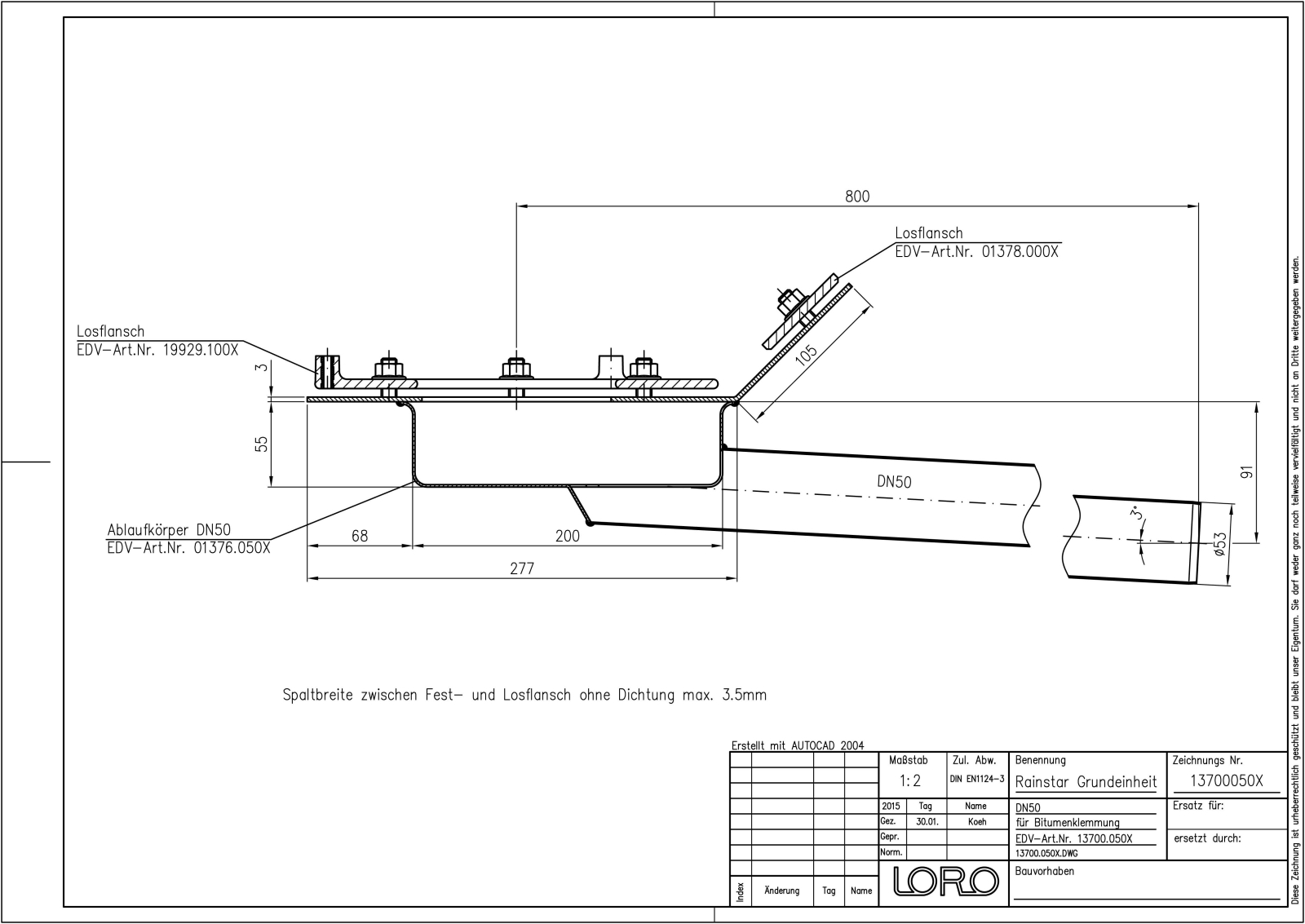 mit Klemmflansch als Los- und Festflanschkonstruktion für Bitumen-Abdichtungsbahnen aus Edelstahl DN 50