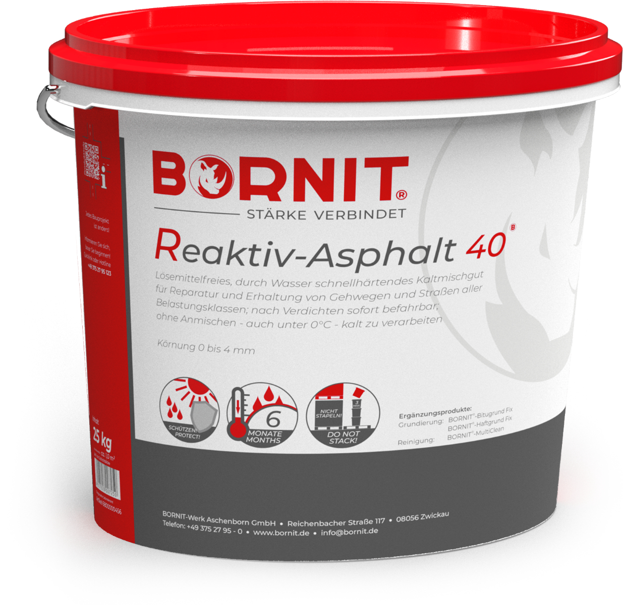 Reaktiv, durch Wasser schnell aushärtendes Kaltmischgut für Reparatur und Erhaltung von Straßen, Gehwegen, Bahnsteigen, Einfahrten und Höfen, leicht und ohne Anmischen kalt verarbeitbar, nach Verdichten sofort befahrbar, für Asphalt- und Betonstraßen aller Belastungsklassen, ausgezeichnete Standfestigkeit und Haltbarkeit, unter 0°C einbaubar, überbaubar, recyclingfähig, lösemittelfrei und umweltschonend, Körnung 0 bis 4 mm.