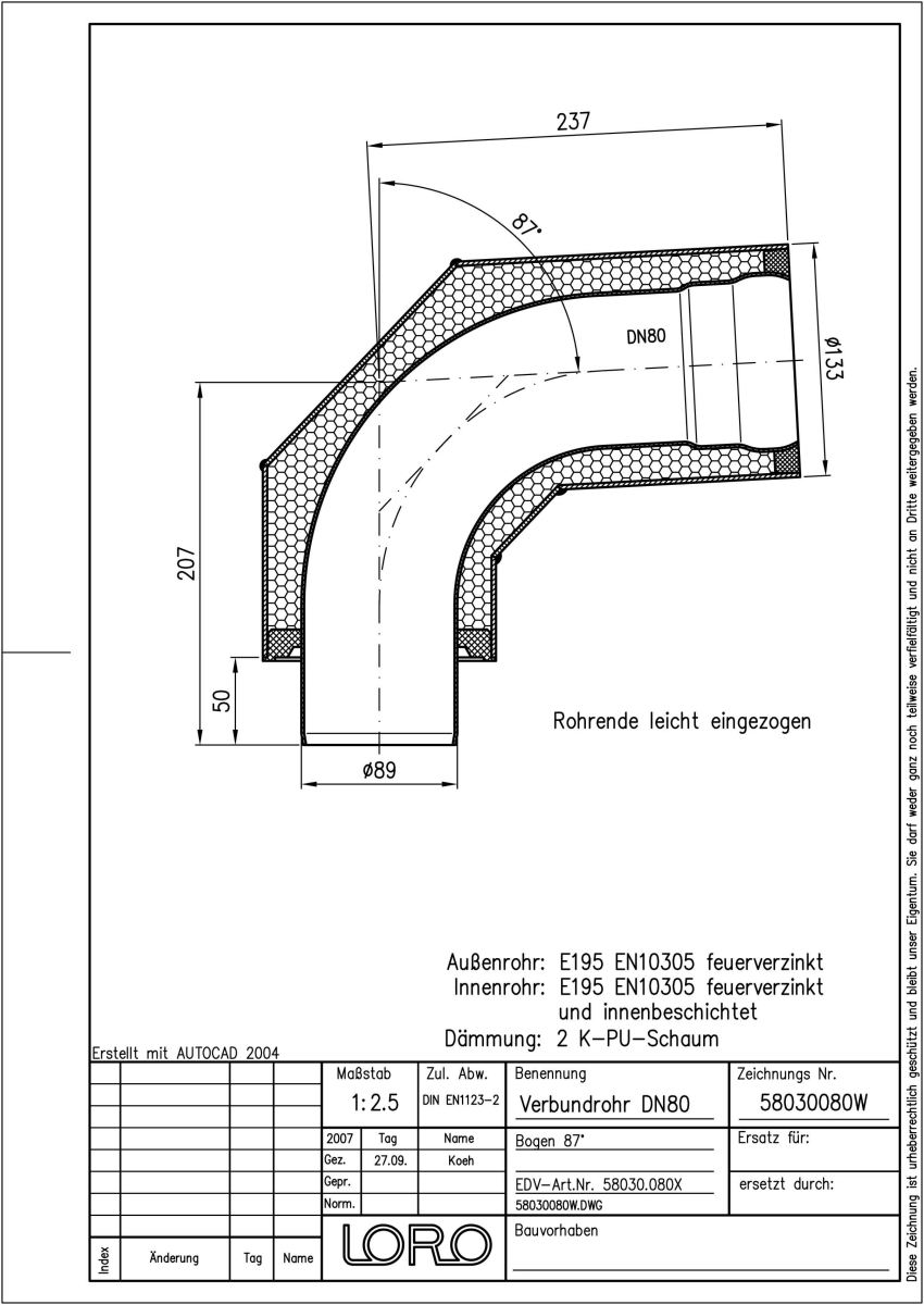 LORO-X Verbundrohr-Bogen, bestehend aus Innenrohr (LORO-X Rohr, aus Stahl, feuerverzinkt, nach DIN EN 1123, mit erhöhtem Qualitätsstandard gemäß RAL-Gütezeichen GZ-694, mit 2-Kammern-Steckmuffenverbindung, Baustoffklasse A1, formstabil, bruchfest, rückstausicher, langlebige Innenbeschichtung gemäß DIN EN ISO 2178 auf Basis einer 2K-Epoxid-Kombination, Farbton: Rotbraun), Dämmschicht (PU-Hartschaum B2, FCKW-frei) und Außenrohr (LORO-X Rohr, feuerverzinkt), 87 Grad, DN 80