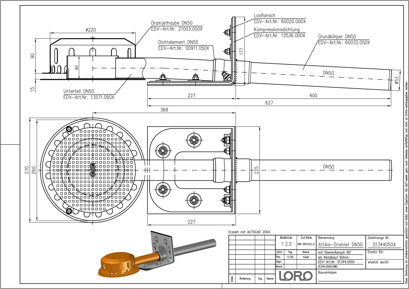 LORO-X DRAINLET Attikaablauf, Serie 62 ohne Eingriff ins Dach, für Notentwässerung mit Freispiegelströmung, Abflussleistung 1,0 l/s bei 75 mm Wasserhöhe auf dem Dach und Wehrhöhe 60 mm, mit Klemmflansch, als Los- und Festflanschkonstruktion, 90 Grad Aufkantung für Kunststoff-Abdichtungsbahnen, Eingrifftiefe 0 mm, nach DIN EN 1253, Leistungsnachweis als Speier ohne Fallleitung gemäß Systemdatenblatt LX1585, aus Edelstahl, DN 50