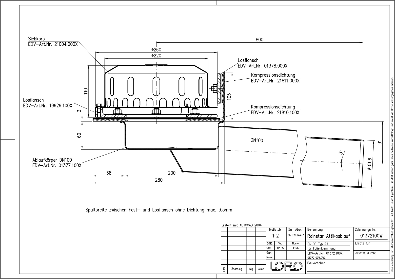 LORO-X RAINSTAR Attikaablauf, Serie 79 (RA) mit tiefgelegtem Rohr, für Hauptentwässerung mit Freispiegelströmung, Abflussleistung 5,4 l/s bei 35 mm Wasserhöhe auf dem Dach, mit Klemmflansch, als Los- und Festflanschkonstruktion, 90 Grad Aufkantung für Kunststoff-Abdichtungsbahnen, Eingrifftiefe 106 mm, mit DRAINLET-Haube aus Edelstahl, nach DIN EN 1253, Leistungsnachweis mit normgerechtem Prüfsystem mit 4,2m nicht belüfteter Fallleitung gemäß Systemdatenblatt LX479, aus Edelstahl, DN 100