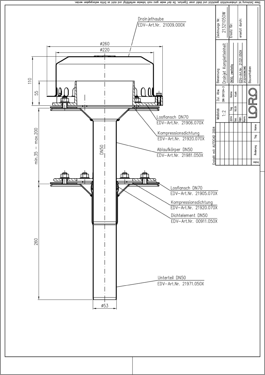 LORO-X DRAINJET Flachdach-Schnellablauf, Serie 49(DJ) zweiteilig ohne Wärmedämmung, Auslauf senkrecht, für Notentwässerung mit Druckströmung, Abflussleistung 9,0 l/s bei 75 mm Wasserhöhe auf dem Dach, mit Klemmflansch als Los- und Festflanschkonstruktion inklusive Kompressionsdichtungen, für Bitumen und Kunststoff Abdichtungsbahnen, DRAINJET-Haube aus Edelstahl, nach DIN EN 1253 mit erhöhtem Qualitätsstandard gemäß RAL-Gütezeichen GZ-694, Leistungsnachweis mit normgerechtem Prüfsystem mit 4,2m nicht belüfteter Fallleitung gemäß LX-Datenblatt LX1340, aus Edelstahl, DN 50