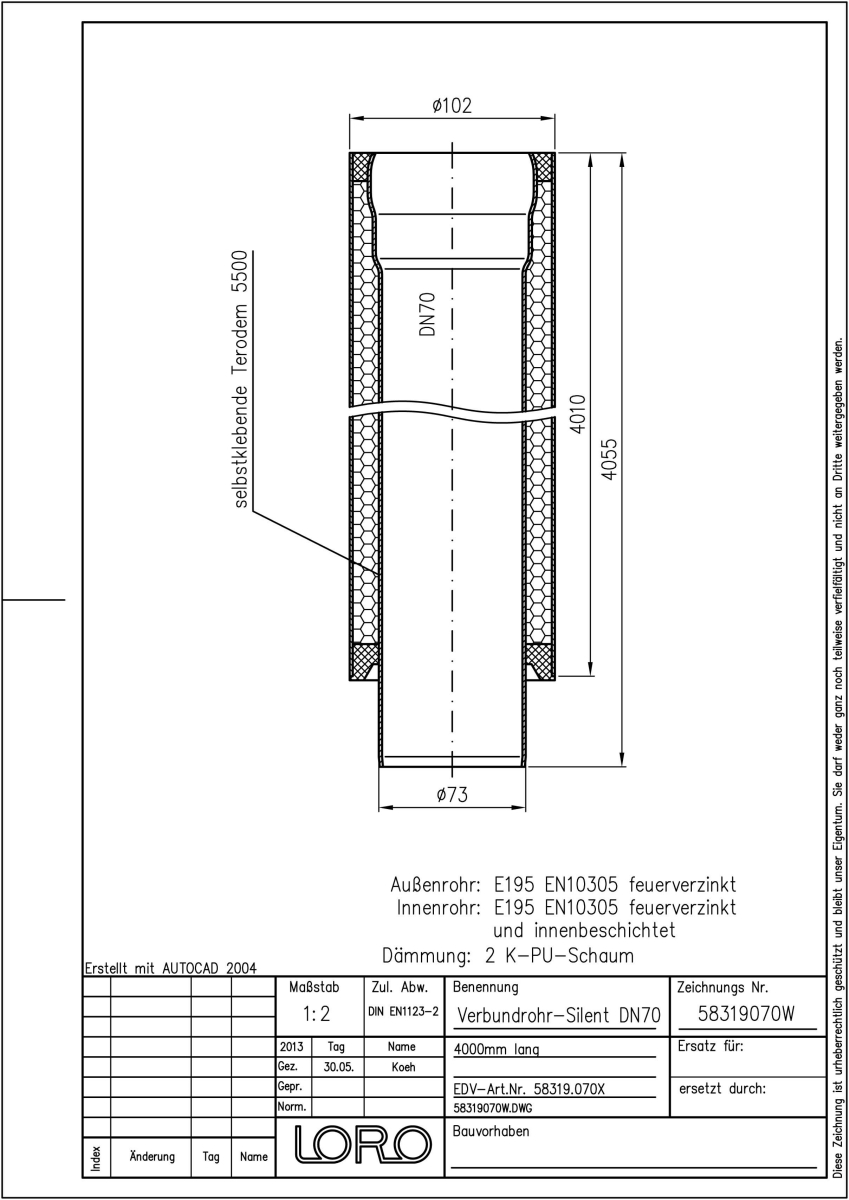 LORO-X Verbundrohr, Ausführung SILENT, für erhöhte Schalldämmung, bestehend aus: Innenrohr (LORO-X Rohr, aus Stahl, feuerverzinkt, nach DIN EN 1123, mit erhöhtem Qualitätsstandard gemäß RAL-Gütezeichen GZ-694, mit 2-Kammern-Steckmuffenverbindung, Baustoffklasse A1, formstabil, bruchfest, rückstausicher, langlebige Innenbeschichtung gemäß DIN EN ISO 2178 auf Basis einer 2K-Epoxid-Kombination, Farbton: Rotbraun), Schallschutzmatte (am Innenrohr angebracht), Dämmschicht (PU-Hartschaum B2, FCKW-frei) und Außenrohr (LORO-X Rohr, feuerverzinkt) 4000 mm lang, DN 70