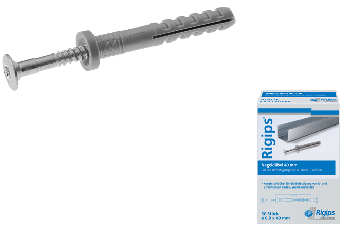 Der Rigips Nageldübel ist ein Kunststoffdübel mit pilzförmigen Kopf von ca. 10 mm Durchmesser und einer Nagelschraube aus Stahl. Der Rigips Nageldübel dient zur Befestigung von U- und C-Profilen an Boden, Wand und Decke. Das Einbringen des Dübels in massive Untergründe aus Beton und Mauerwerk) erfolgt durch einfaches Einschlagen in das Bohrloch.