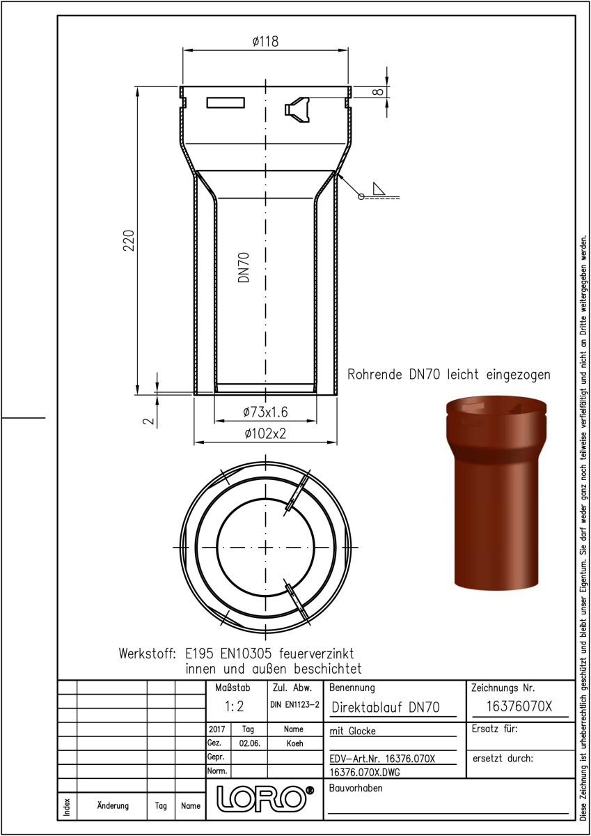 LORO-X Balkondirektablauf, Serie I mit Glocke, einteilig ohne Wärmedämmung, Auslauf senkrecht, nach DIN EN 1253 mit erhöhtem Qualitätsstandard gemäß RAL-Gütezeichen GZ-694, aus Stahl feuerverzinkt, mit langlebiger Beschichtung gemäß DIN EN ISO 2178 auf Basis einer 2K-Epoxid-Kombination, Farbton: Rotbraun, für Plattenstärke 220 mm, ohne Sieb, DN 70