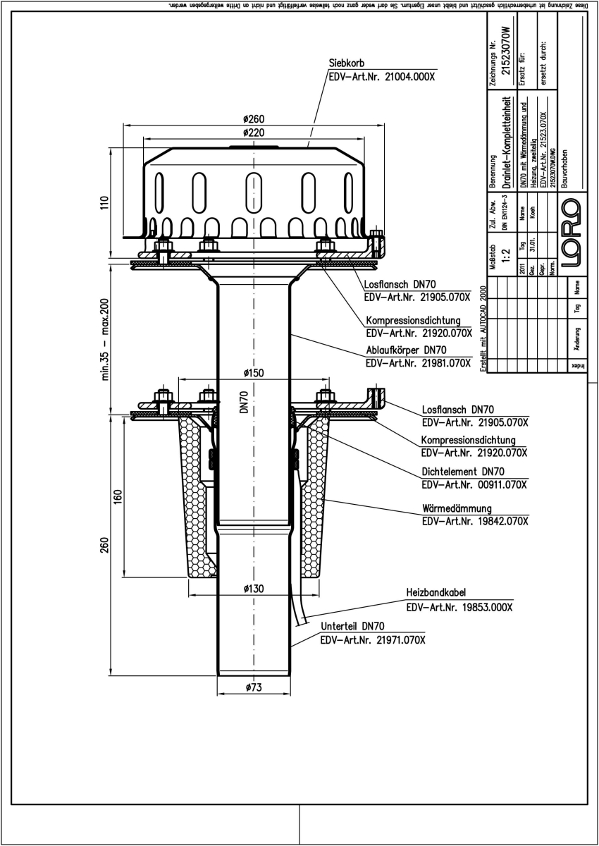 LORO-X DRAINLET Flachdachablauf, Serie 84(DL) zweiteilig mit Wärmedämmung und Heizung, Auslauf senkrecht, für Hauptentwässerung mit Freispiegelströmung, Abflussleistung 6,3 l/s bei 35 mm Wasserhöhe auf dem Dach, mit Klemmflansch als Los- und Festflanschkonstruktion inklusive Kompressionsdichtungen, für Bitumen- und Kunststoff- Abdichtungsbahnen, DRAINLET-Haube aus Edelstahl, nach DIN EN 1253 mit erhöhtem Qualitätsstandard gemäß RAL-Gütezeichen GZ-694, Leistungsnachweis mit normgerechtem Prüfsystem mit 4,2m nicht belüfteter Fallleitung gemäß LX-Datenblatt LX846, aus Edelstahl, DN 70
