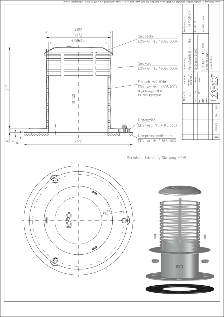 LORO-X VARIOFIT Strömungshilfe, objektbezogene Ausführung, gewünschte Wehrhöhe bei Bestellung angeben, für die Notentwässerung mit Freispiegelströmung, variabler Wehrhöhe, passend für DRAINLET Flachdachablauf, Serie 84(DL), DN 100