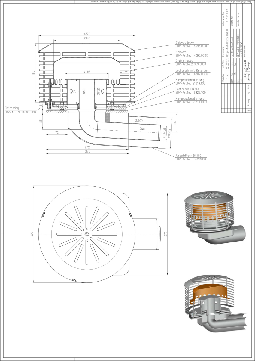 LORO-X Retentions-Attikaablauf mit objektbezogenen Retentionsöffnungen für die Hauptentwässerung und höhenvariablem Wehr für die Notentwässerung, Haupt-Not-Kombi, Serie 88, Attika-Distant, Rohr in Rohr, für Hauptentwässerung mit Freispiegelströmung und Notentwässerung mit Druckströmung, mit Klemmflansch, als Los- und Festflanschkonstruktion, ohne Aufkantung für Bitumen- und Kunststoff-Abdichtungsbahnen, DN 100/50