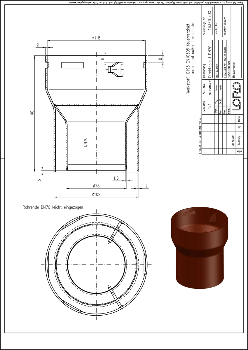 LORO-X Balkondirektablauf, Serie I mit Glocke, Auslauf senkrecht, nach DIN EN 1253 mit erhöhtem Qualitätsstandard gemäß RAL-Gütezeichen GZ-694, aus Stahl feuerverzinkt, mit langlebiger Beschichtung gemäß DIN EN ISO 2178 auf Basis einer 2K-Epoxid-Kombination, Farbton: Rotbraun, für Plattenstärke 140 mm, ohne Sieb, DN 70