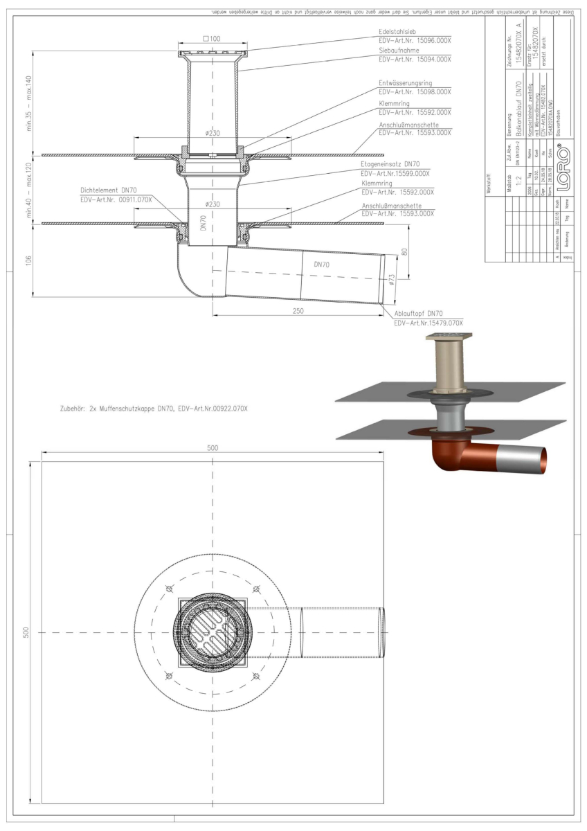 LORO-X Balkonablauf, Serie F, zweiteilig ohne Wärmedämmung, Auslauf seitlich 3 Grad, mit vormontierter Anschlussmanschette aus Bitumen EPDM Verbund, nach DIN EN 1253 mit erhöhtem Qualitätsstandard gemäß RAL-Gütezeichen GZ-694, aus Stahl feuerverzinkt, mit langlebiger Beschichtung gemäß DIN EN ISO 2178 auf Basis einer 2K-Epoxid-Kombination, Farbton: Rotbraun, bestehend aus Ablauftopf, Anschlussmanschette, Klemmring, Dichtelement, Etageneinsatz (für Aufbauhöhe 40 - 120 mm), Anschlussmanschette, Klemmring, Entwässerungsring, Siebaufnahme 100 x 100 mm (für Aufbauhöhe 35 - 140 mm), Edelstahlsieb, DN 70