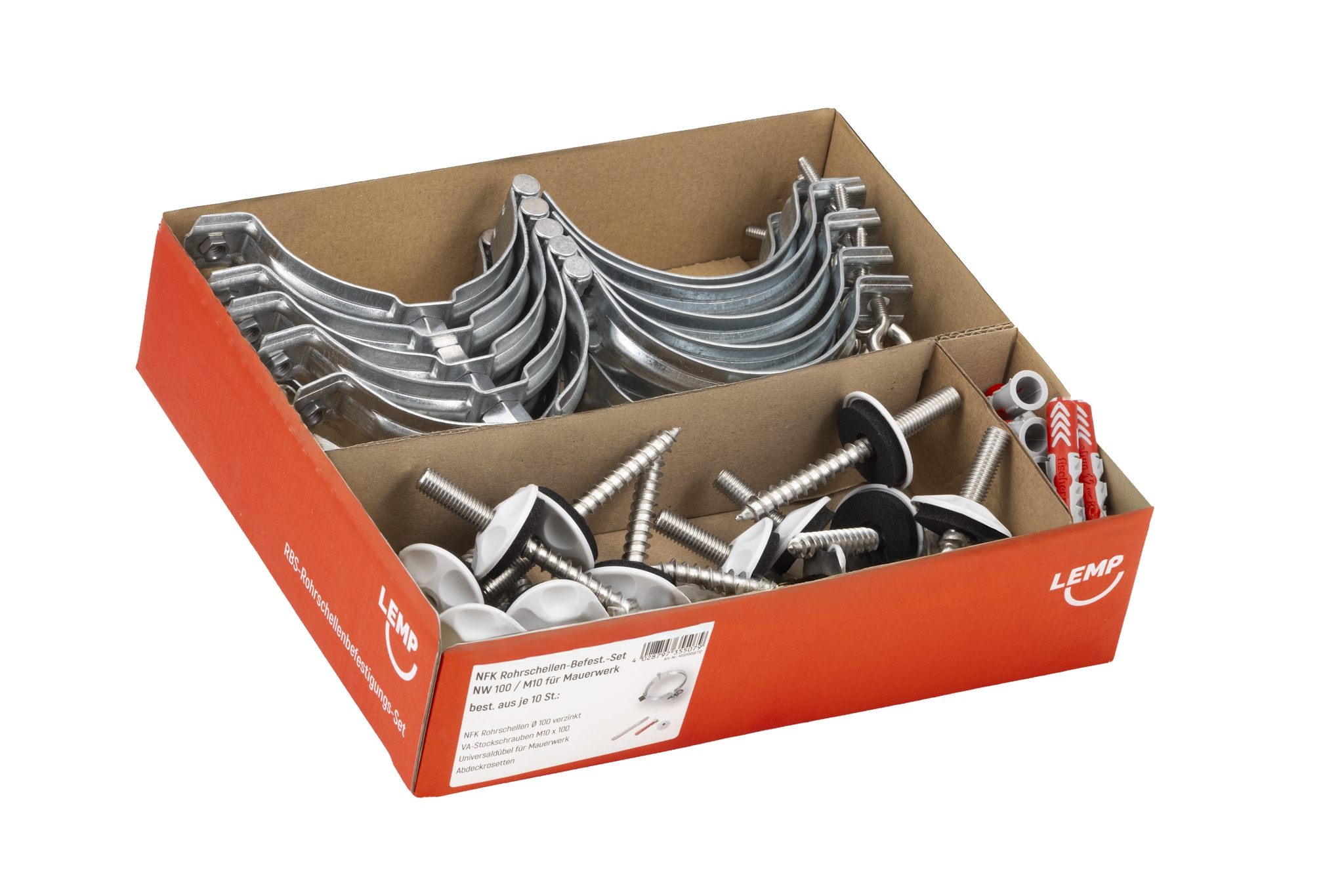 Dübel für die Verankerung in der Wand, M10 Stockschrauben, Abdichtrosetten und natürlich der NFK Rohrschelle selbst.