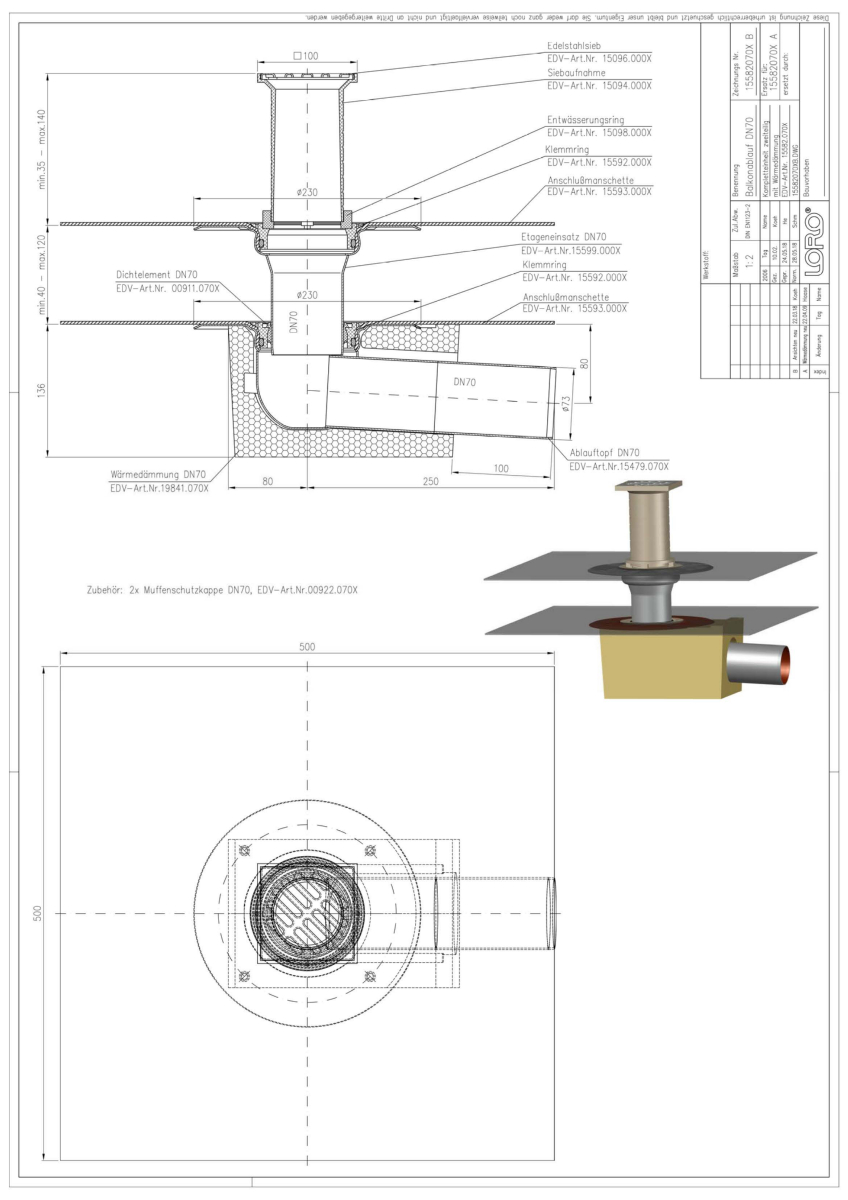 LORO-X Balkonablauf, Serie F, zweiteilig mit Wärmedämmung, Auslauf seitlich 3 Grad, mit vormontierter Anschlussmanschette aus Bitumen EPDM Verbund, nach DIN EN 1253 mit erhöhtem Qualitätsstandard gemäß RAL-Gütezeichen GZ-694, aus Stahl feuerverzinkt, mit langlebiger Beschichtung gemäß DIN EN ISO 2178 auf Basis einer 2K-Epoxid-Kombination, Farbton: Rotbraun, bestehend aus Ablauftopf, Anschlussmanschette, Klemmring, Dichtelement, Etageneinsatz (für Aufbauhöhe 40 - 120 mm), Anschlussmanschette, Klemmring, Entwässerungsring, Siebaufnahme 100 x 100 mm (für Aufbauhöhe 35 - 140 mm), Edelstahlsieb, DN 70