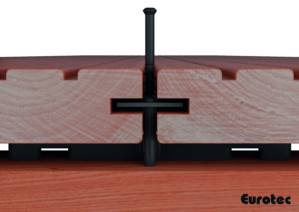 Bei Einhaltung der Verlegevorgaben von Eurotec, ermöglicht der T-Stick ein leichtes Justieren der Dielen, bevor diese fest verschraubt werden. Nach dem Verschrauben sitzen die Dielen absolut fest. Muss eine Diele ausgetauscht werden, ist das mit diesem System auch nach Fertigstellung der Terrasse möglich.
