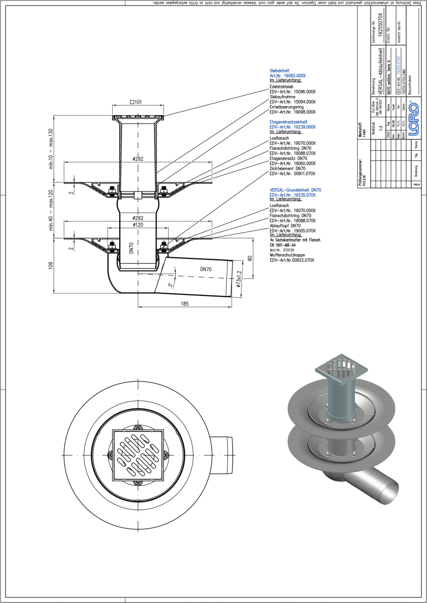 LORO-X VERSAL Balkonablauf, Serie K, zweiteilig ohne Wärmedämmung, Auslauf seitlich 3 Grad, mit Klemmflansch, nach DIN EN 1253 mit erhöhtem Qualitätsstandard gemäß RAL-Gütezeichen GZ-694, aus Edelstahl, bestehend aus Ablauftopf, Flanschdichtring, Losflansch, Dichtelement, Etageneinsatz (für Aufbauhöhe 40 - 120 mm), Flanschdichtring, Losflansch, Entwässerungsring, Siebaufnahme 100 x 100 mm (für Aufbauhöhe 10 - 130 mm), Edelstahlsieb, DN 70