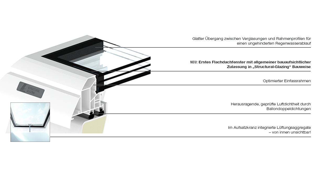 - Das erste allgemein bauaufsichtlich zugelassene Flachdachfenster in „Structural Glazing“-Bauweise – zertifiziert durch das Deutsche Institut für Bautechnik in Berlin (DIBt)