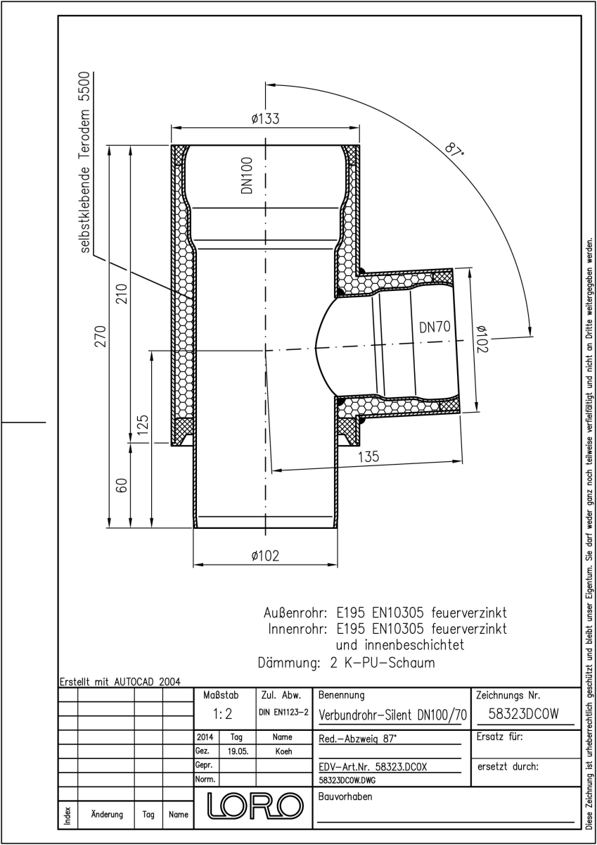 LORO-X Verbundrohr-Red.-Abzweig, Ausführung SILENT, für erhöhte Schalldämmung, bestehend aus: Innenrohr (LORO-X Rohr, aus Stahl, feuerverzinkt, nach DIN EN 1123, mit erhöhtem Qualitätsstandard gemäß RAL-Gütezeichen GZ-694, mit 2-Kammern-Steckmuffenverbindung, Baustoffklasse A1, formstabil, bruchfest, rückstausicher, langlebige Innenbeschichtung gemäß DIN EN ISO 2178 auf Basis einer 2K-Epoxid-Kombination, Farbton: Rotbraun), Dämmschicht (PU-Hartschaum B2, FCKW-frei) und Außenrohr (LORO-X Rohr, feuerverzinkt) 87 Grad, DN 100/70